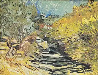 Vincent van Gogh painted A Road at Saint-Remy with Female Figure while staying in Saint-Remy in 1889.[1] The distinctive painting style of Van Gogh's later works is very apparent in this painting as the road, vegetation and sky is all rendered with his thick characteristic brush strokes.