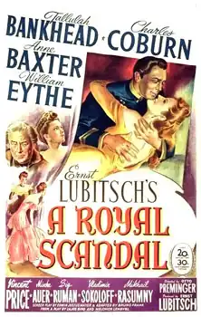 A Royal Scandal, also known as Czarina, is a 1945 American comedy-drama film directed by Otto Preminger, produced by Ernst Lubitsch, about the lovelife of Russian empress Catherine the Great. It stars Tallulah Bankhead, Charles Coburn, Anne Baxter and William Eythe. The film was based on the play Die Zarin (The Czarina) by Lajos Bíró and Melchior Lengyel.