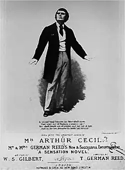 A Sensation Novel is a comic musical play in three acts (or volumes) written by the dramatist W. S. Gilbert, with music composed by Thomas German Reed. It was first performed on 31 January 1871 at the Royal Gallery of Illustration. Only four of German Reed's songs survive.[1] Nearly 25 years later, the music was rewritten and published by Florian Pascal (Joseph Williams, Jr).[2] The story concerns an author suffering from writer's block who finds that the characters in his novel are dissatisfied.