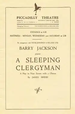 A Sleeping Clergyman is a 1933 play in Two Acts by James Bridie.[2][3] Directed by H. K. Ayliff, it opened at Malvern's Festival Theatre in July 1933, before moving to London's Piccadilly Theatre in September, where it ran for 230 performances.[4] It then transferred to Broadway's Guild Theatre in October 1934, where it closed after 40 performances.[5] It was revived, again with Robert Donat, at London’s Criterion Theatre in 1947.[6]