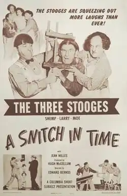 A Snitch in Time is a 1950 short subject directed by Edward Bernds starring American slapstick comedy team The Three Stooges (Moe Howard, Larry Fine and Shemp Howard). It is the 128th entry in the series released by Columbia Pictures starring the comedians, who released 190 shorts for the studio between 1934 and 1959.