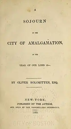 - ^ Bolokitten, Oliver (1835). A sojourn in the city of Amalgamation : in the Year of Our Lord 19--. Boston Public Library. New York: Self-Published.