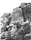 The shape of [Aadloun's rock-cut] tombs is not the only stamp of antiquity that distinguishes this necropolis from other burial places found in Syria. We also see one of these Egyptian steles, quite similar to those we have drawn on the banks of Nahar-el-Kelb, not far from Beirut. The Adloun stele depicted a conqueror making an offering of prisoners to the god Phtha. This is all that can be recognized, even with the help of the shadows projected by the light of a torch. The corrosive action of the sea air has erased the hieroglyphic legend that covered this stele from the height of the god's shoulders to the bottom of the frame, and only a few isolated signs are visible.