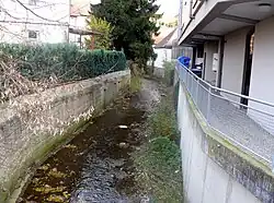 The Aal is a small river in the town of Aalen in Baden-Württemberg, Germany.[1] It originates in the Dürrwiesen near the road bridge of the K 3326 at the western end of the street Gartenstraße through the confluence of the left Rombach and the right Sauerbach, that slightly exceeds the Rombach in length and area of basin. From here, the Aal first flows in an eastern and later northeastern direction.[1] After 1.6 km, it flows on the left side of the Reichstädter Markt into the Kocher.