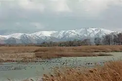 The swamp lies on one of the most important bird migration routes in the world, and over 250 species of birds have been recorded in the area,[2] including the globally vulnerable greater spotted eagle (Aquila clanga), eastern imperial eagle (Aquila heliaca), and lesser kestrel (Falco naumanni). Records of globally near-threatened bird species at the wetland include great snipe (Gallinago media), ferruginous duck (Aythya nyroca) and pallid harrier (Circus macrourus). In addition to the diversity of birds in the area, there are a variety of animals living in and around the marsh. Twenty-three species of mammals have been recorded, including jungle cat (Felis chaus) and European otter (Lutra lutra). Five species of amphibians and twelve species of reptiles have been recorded, and a two-year weekly butterfly survey found fifty-three species of butterflies in the area. The wetland lies 7 km SSW of the city of Qab Elias on the eastern edge of Mount Lebanon. The main area of reedbeds and open pools covers 253 ha, stretching east from the foot of the mountains to the Litani River in a long strip. Rain and snow falling on the high ridge of Barouk mountain to the west provide water for the wetland. Surrounding the open water and reed bed are areas of rough grazing, cultivated land, drainage ditches, and an avenue of trees, all adding to the diversity of habitats in the area. On the nearby mountain slopes, small wooded areas and rocky shrubland give an even greater variety of habitats and species. Behind the nearby village of Aammiq are woods where Syrian woodpecker (Dendrocopus syriacus) and Syrian serin (Serinus syriacus) can be found. In spring and summer, shrubby hillsides are home to assorted buntings, wheatears, warblers and shrikes, and rocky gorges host western rock nuthatch (Sitta neumayer) and Eurasian eagle owl (Bubo bubo). Mammals present include Caucasian squirrel, wildcat, wild boar and the Indian porcupine.