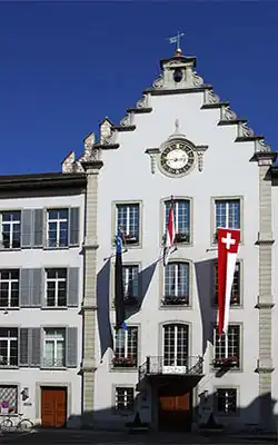 Aarau (Swiss Standard German: [ˈaːraʊ], Alemannic German pronunciation: [ˈɑːræu̯]) is a town, a municipality, and the capital of the northern Swiss canton of Aargau. The town is also the capital of the district of Aarau. It is German-speaking and predominantly Protestant. Aarau is situated on the Swiss plateau, in the valley of the Aare, on the river's right bank, and at the southern foot of the Jura Mountains,[3] and is west of Zurich,[4] 58 kilometres (36 miles) south of Basel and 65 kilometres (40 miles) northeast of Bern.[5] The municipality borders directly on the canton of Solothurn to the west. It is the largest town in Aargau. At the beginning of 2010 Rohr became a district of Aarau.[6]