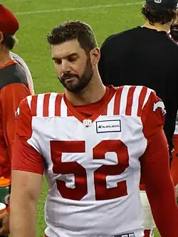On October 27, 2017, he tore his anterior cruciate ligament and meniscus, but still finished the game.[4] He had reconstructive surgery in Hamilton and rehabbed his knee there, instead of heading home to Medicine Hat, Alberta.[4] He became a free agent in 2018 and when he was healthy, he re-signed with the Tiger-Cats on July 23, 2018.[5] He played in 13 regular season games and two post-season games in 2018.
