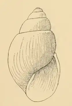 The ovoid shell is heavy and yellowish white. It measures 5.3 mm. The small whorls of the protoconch are almost completely immersed in the first of the succeeding volutions. The five whorls of the teleoconch are inflated and increase rapidly in size. They are subtabulately shouldered at the summit, marked by numerous fine lines of growth and equally abundant, loosely placed, wavy spiral striations. These lines of growth and spiral markings give the surface a finely reticulated appearance when viewed under high magnifications. The periphery and base of the body whorl are decidedly rounded and inflated, marked like the space between the sutures. The aperture is large, suboval, slightly effuse anteriorly. The posterior angle is acute. The outer lip is sharp at the edge but thick within. The columella is very strong, curved, reinforced by the body whorl, from which the slightly reflected edge is separated only by a narrow line. A strong oblique fold, not completely visible when the aperture is viewed squarely, is located a little anterior to the insertion of the columella.[3]