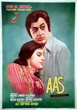 Aas is a 1973 Pakistani Urdu romantic drama film directed by Ali Sufiyan Afaqi.[1] The lead cast included Shabnam, Muhammad Ali, Aqeel, Nanha, Saiqa, and Qavi. Aas won 8 Nigar Awards in different categories, including the best film of the year. The film was also exhibited at the Tashkent International Film Festival in the Soviet Union in 1987.[2][3]