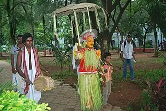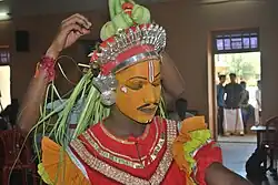 The costume differs by region, In Sullia, Aati Kalenja dancer wears a face mask which is made from the spathe of an areca nut branch. [4]