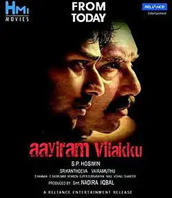 Aayiram Vilakku (transl. Thousand Lights) is a 2011 Indian Tamil-language action thriller film directed by S. P. Hosimin. The film stars Sathyaraj and Shanthanu Bhagyaraj, whilst Sana Khan, Suman, Kamal Kamaraju, and Ganja Karuppu, play pivotal roles.[2] The film, produced by HMI Pictures and scored by Srikanth Deva, was released on 23 September 2011.[1] The movie received mixed reviews.[3]