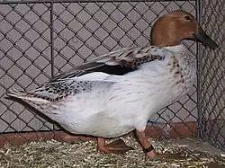 The Abacot Ranger was developed between 1917 and 1922 by Mr. Oscar Gray of Abacot Duck Ranch, Friday Wood, Colchester in the United Kingdom, the name of the 'Ranch' being derived from Gray's home at Abbott's Cottages. Some white 'sports' occurred among his flock of Khaki Campbell's, and these Mr. Gray mated to white Indian Runner drakes and the progeny were named Hooded Rangers[1] and entered at the Wye College egg-laying trials 1922–23, where they gave a good account of themselves with the highest score in their section.[2] The name was changed to Abacot Ranger for the egg-laying trials at Bentley, and remained as such. It was initially a popular breed for egg and meat production, but soon became extinct in the United Kingdom. and the breed was then returned to the United Kingdom in the 1970s[3] from Germany.[4] The Abacot Ranger was accepted into the British Waterfowl Standard in 1983.[5]