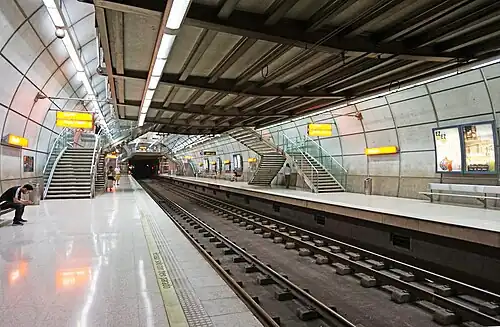 Abando is a station on lines 1 and 2 of the Bilbao metro. The station is located in the neighborhood of Abando, in the district with the same name. The station is located close to Bilbao-Abando railway station, to which it is directly connected. It opened on 11 November 1995.[3] It is one of the busiest stations in the network.