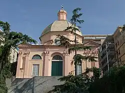 The abbatial church of Santa Maria della Sanità is located in Salita di Santa Maria della Sanità, in the Castelletto quarter of Genoa. Originally, it was the private chapel of villa De Mari (now villa Grüber). It was built in the 17th century by the Genoese nobleman Stefano De Mari, who bestowed it to the Descalced Carmelites of the nearby Church of Sant'Anna. It has a rare octagonal layout, a wide cupola and seven lateral chapels, which make it a jewel of the religious architecture of Genoa.[1]