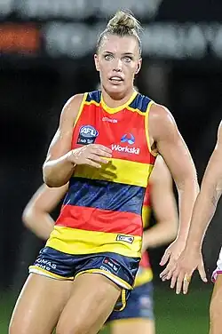Abbey Holmes (/hɒlmz/ HOLMZ;[1] born 7 January 1991) is a former Australian rules footballer who played for the Adelaide Football Club in the AFL Women's (AFLW). She began playing football for the Waratah Football Club in the Northern Territory Football League in 2012 and won four consecutive premierships with the club, along with being the league's leading goalkicker the same four seasons. In 2014, she became the first woman to kick 100 goals in a season in an established football league, and in 2016 she was drafted in the inaugural AFL Women's draft by Adelaide.