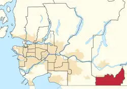 As of the 2012 federal electoral boundaries redistribution, the district includes the southeastern portion of the City of Abbotsford and the Upper Sumas 6 Indian reserve.[10]