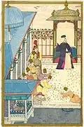 As a young man, he journeyed to Constantinople, where he pursued studies at the painting academy located within the Topkapı Palace. Levnî began his work in Istanbul during Sultan Mustafa II's rule and eventually became chief painter (boyacı) at the palace atelier.[2] During his stay at the palace, he specialized in the Saz style, which is characterized by stylized leaf designs.[2] In spite of his high artist status, his name does not appear on a lists of artists working for the palace during his time.[2] However, his signed artworks and influence on subsequent artists are evidence that he was an important artist of his time.[2] Levnî died in Istanbul during the early 18th century.[1]