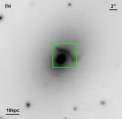 The BCG also acts as a gravitational lens, bending the light of a more distant background galaxy (at redshift 0.451) into an apparent tangential arc about 6 kpc to one side.[1] This makes the galaxy an important case in investigations of the intrinsic properties of dark matter.