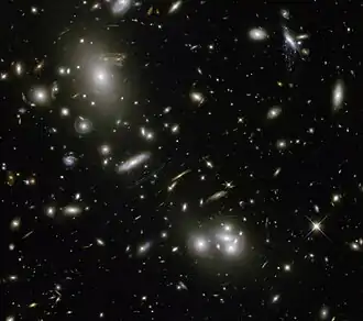 ![]() The galaxy cluster, Abell 68 captured by the Hubble Space Telescope in 2012 | |
