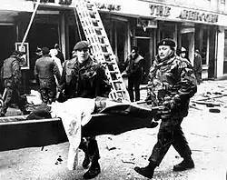 ![]() A victim's body being removed from the scene by members of the security forces following the bomb explosion | |