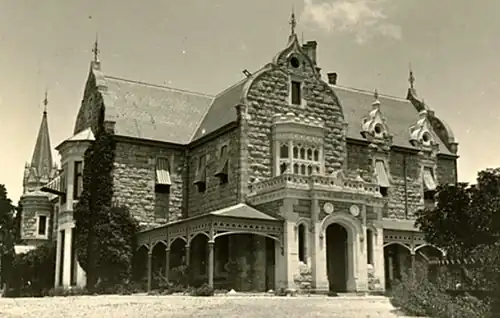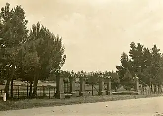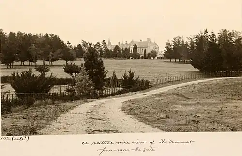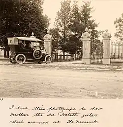 The secondary gates at Abercrombie House are much older than the house which was built in 1870. They were brought from Toxteth Park in Sydney which is now St Scholastica's College. Toxteth Park was built in 1829 so this is the probable date of these gates. Toxteth Park was the home of Sir George Wigram Allen who was the brother in law of Harriet Stewart, the wife of James Horne Stewart. The house was sold in 1901 to the Good Samaritan Sisters and they wished to bring the gates from their old convent in Pitt St which was being demolished.[10] The gates from Toxteth Park were no longer needed so they were transported to Abercrombie House. In the early 1900s Arthur Wigram Allen who was Harriet's nephew visited his relatives at Abercrombie house. Arthur's mother Lady (Marian) Allen was Harriet's sister. Arthur photographed the gates mentioning that they were from Toxteth Park. See photograph on the right.
