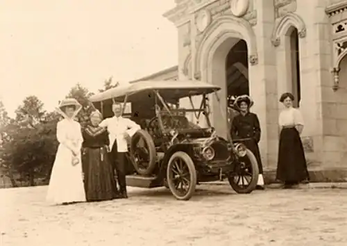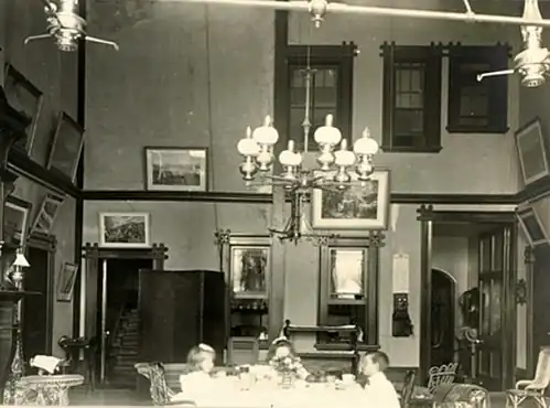 | Abercrombie House in 1909. From left to right are Ethel Allen (Arthur Allen's wife), Harriet Stewart, Albyn Stewart (Harriet's son), Helen Austin (a friend of the Allens) and Miss Lindsay. | A room in Abercrombie House in 1901. | A carriage outside Abercrombie House in 1901. |