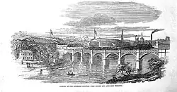 The extension to the permanent terminal station at Aberdeen, known as "Guild Street", was opened on 2 August 1854.[note 2][2][8][9] This involved bridging the River Dee: a laminated timber design was used, but this proved not to be durable and was reconstructed in the 1880s. With the increasing importance of the Great North of Scotland Railway, running north from Aberdeen, agreement was made to construct a larger station that they would use jointly. This Joint Station opened on 4 November 1867, by which time the Caledonian Railway had absorbed the Aberdeen Railway Company.[6] (The name Aberdeen Joint Station was changed to simply Aberdeen in 1952.[10]