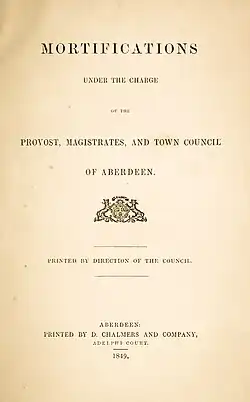 - ^ Anonymous, Mortifications Left to Various Classes of Poor under Charge of the Provost, Magistrates, and Town Council, 1835; Aberdeen (Scotland). Town Council., List of Mortifications for Educational and Charitable Purposes, under the Charge of the Town Council of Aberdeen, 1879 (Aberdeen: Avery, 1879).
