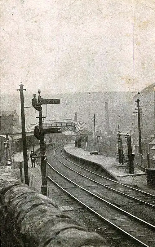The first Abertillery station was replaced by a second situated 185 metres (202 yd) north in c. 1893/4.[7][8] Solidly-built stone buildings were provided on the Up platform.[4] The platforms were constructed of timber in order to reduce the weight on the made-up land on the valley side.[9] Just to the south of the station was Abertillery Junction where a short mineral branch less than a mile long diverged to serve Cwmtillery Colliery from 1858 to 1963.[10][4] The station had 59 employees in 1929 and 48 in 1938.[11] In the 1930s, a combined rail and theatre ticket was issued which allowed passengers from certain stations in the Western valleys of Monmouthshire to travel to Abertillery which at the time had four cinemas.[12]