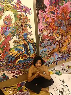 His paintings, drawings and digital works have featured in the following exhibitions: "Heroes and Villains: the Battle for Good in India's Comics" at the Los Angeles County Museum of Art (LACMA);, "Transcendent Deities of India: The Everyday Occurrence of the Divine" at the Asia Society in Houston, Texas; at the ghats of Varanasi, India; a social impact project organized by Ojas Art Foundation, other exhibitions include "Dhyana Roopa" at the Academy of Fine Arts and Literature in Delhi, "India Imagined" sponsored by the Nirula Family Art Trust and at the visionary Fractal Gallery at Burning Man sponsored by the Black Rock Arts Foundation.