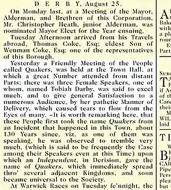 In August 1774 Darby spoke at a regional meeting of Quakers at Derby Town Hall. The Derby Mercury reported her name as Tobiah and said she was the best of three female speakers. The journalist also noted that she was speaking in Derby and this was the town where the Quakers first got their name. This was the town, but the newspaper gave the wrong reason. It was a Derby magistrate, Gervase Bennet, who had first used the term to deride George Fox in 1650 as he tried him for blasphemy.[6] It is thought that Darby was speaking at the same place at which George Fox had been imprisoned, although she may not have been aware of it, as this was a new town hall.[7]