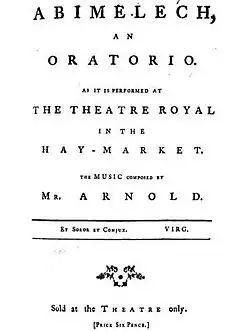 Abimelech was performed once at the Theatre Royal on 18 March 1768 and once, after Smart's death, at Covent Garden on 25 March 1772.[4] There are no surviving scores for Abimelech, but the libretto was sold during its run at the Theatre Royal, Haymarket, in 1768 and the run of the revised version of the oratorio at the Covent Garden in 1772.[5] These works were published anonymously but Charles Burney, Smart's friend, attributes the libretto to Smart and pasticcios from Handel in his General History of Music.[6] The "pasticcios" were musical selections from Handel used by the composer Samuel Arnold.[4]