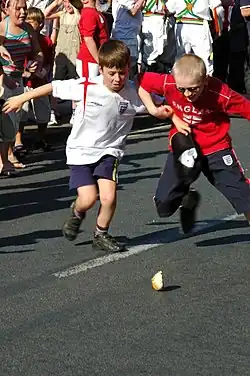 Every October,[59] the Abingdon Michaelmas Fair is run. Extending to the length of a mile,[60] the fair is thought to be the longest[61][62] and oldest[63] street fair in Europe. It runs through the Market Place, High Street, and Ock Street.[60] The fair was originally a hiring fair, designed to allow farmworkers from rural areas to find work in the town[60] following the Black Death in 1348/9.[64][65] The fair, previously run on the first Monday and Tuesday before 11 October each year, had its dates extended in 2024 to also run one day earlier, from the Sunday to the Tuesday.[62] The much smaller Runaway Fair is run the Monday following the Michaelmas Fair,[66][67] and was traditionally for workers who were unsatisfied with their employment after the first week, and sought to "run away" and return to the town to find better job opportunities.[66] Abingdon has a very old and still active Morris dancing tradition, passed on since before the folk dance and song revivals in the 19th century.[68][69] Every year a mayor of Ock Street is elected by the inhabitants of Ock Street; he then parades through the town preceded by the famous Horns of Ock Street, a symbol of Abingdon's Morris Dance troupe.