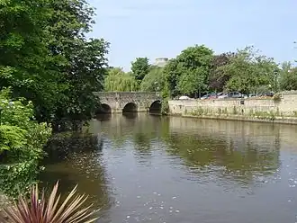 Abingdon Bridge was begun in 1416 and completed in 1422,[3] using local limestone quarried at Besselsleigh and Dry Sandford.[4] The bridge was funded by Abingdon's religious guild, the Fraternity of the Holy Cross, and chiefly by two of the guild's members: a London merchant called William Hales and his wife Maud.[3] The bridge replaced a ferry[4] and its completion severely reduced trade at Wallingford.[5]