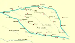 The concession provided to Abir lay in the north of the country and was one of nine commercial concession areas established by Leopold in the Congo Free State. The concession was bounded to the north by the Congo River and the Société Anversoise concession, to the east by the Lomami River and the Lomami Company concession and to the west by the Lulonga Company concession which straddled the Lulonga River, into which the Maringa and Lopori flowed.[9] To the south lay the Crown Domain (Domaine de la Couronne), the private property of Leopold, which comprised the best land in the Free State and was the richest in rubber.[10]