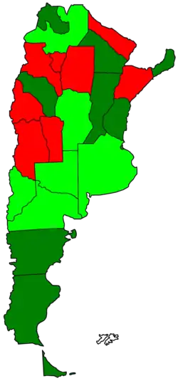 Abortion in Argentina is legal as an elective medical procedure during the first 14 weeks from conception.[1] The abortion law was liberalized when the Voluntary Interruption of Pregnancy Bill was passed by the National Congress in December 2020. According to the law, woman in Argentina can request the procedure at any public or private health facility. Doctors are legally bound to either perform it or, if they are conscientious objectors, refer the patient to another physician or health facility.[2] Only three other Latin or South American countries legalized abortion on request nationwide before Argentina did: Cuba in 1965, Guyana in 1995, and Uruguay in 2012.[3] According to polling in 2020, around 44% of Argentines support the legalization of abortion on request; other polls showed 50–60% of Argentines opposed the bill.[4][5][6][7]