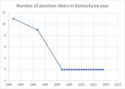 Since around 2002, the two EMW Women's Surgical Centers were the only abortion providers in the state. Other ones that had existed in the state had voluntarily closed.[14] In 2014, there were two abortion clinics in the state.[45] In 2014, 98% of the 120 counties in the state did not have an abortion clinic. That year, 74% of women in the state aged 15–44 lived in a county without an abortion clinic.[46]