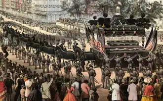 On April 25, 1865, the hearse, carrying Lincoln's body, was drawn through the streets of Manhattan en route to New York City Hall. It was accompanied by an "astounding" escort of 160,000 people, including soldiers, sailors, Marines, and dignitaries, in a lumbering and somber procession observed by half-a-million spectators.[5][4][6] According to one source, upon coming into view, the hearse "just about paralyzed all beholders with its magnificence".[1][4]
