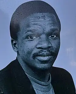 By late 1973 the South African security police were preparing to arrest him.[8] Tiro fled to Botswana, settling at the Roman Catholic Mission in Khale,[8] about 20 km from Gaborone, where he continued to organise for SASO, SASM and the Black Peoples’ Convention, and even forged contacts with the Palestinian Liberation Organisation.[9] While completing an application to study with UNISA,[10] he was handed a parcel bomb—allegedly sent by an agent known only as “Lawrence”—which exploded on 1 February 1974 and killed him instantly.[11] His body was buried in Botswana because the apartheid government refused repatriation. However, the apartheid government proposed for his body to be buried in South Africa if; 1) he can be buried in a steel coffin and; 2) only his family can attend the funeral.[12] Only on 20 March 1998, with support from Azanian People's Organisation (AZAPO) and the Truth and Reconciliation Commission (TRC), were his remains returned to South Africa; he was finally reburied in Dinokana on 22 March 1998.[13] Former Bureau of State Security (BOSS) spy Gordon Winter later revealed that Tiro had been targeted by BOSS’s covert “Z-Squad” unit; the TRC did not formally investigate.[14][15]