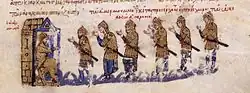 At some point in the second half of the reign of Byzantine Emperor Michael II (r. 820–829), the Andalusis landed on Crete and began its conquest.[7] The exact chronology of the Andalusis' landing in Crete is uncertain. Following the Muslim sources, it is usually dated to 827 or 828, after the Andalusis' expulsion from Alexandria.[8] Byzantine sources however seem to contradict this, placing their landing soon after the suppression of the large revolt of Thomas the Slav (821–823), which weakened Byzantine naval defences. Further considerations regarding the number and chronology of the Byzantine campaigns launched against the invaders and prosopographical questions of the Byzantine generals that headed them have led other scholars like Vassilios Christides and Christos Makrypoulias to propose an earlier date, c. 824.[9] Christides also suggests that Abu Hafs may have landed on the island in 824/25, on his way to Alexandria, and only returned to conquer the island in 825/26, thus explaining the discrepancy of the sources.[2]