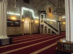 The main hall is a great rectangular hall with an area of 578 square metres (6,220 sq ft). It consists of eight marble pillars with a large dome on top of them with iron chains hanging from them to hold the chandeliers,[24] with three other domes built around it on three rectangular pillars made of stone and plaster. The dome of the main hall is decorated with small accurate trappings, just like the doors and pillars.[24] The walls are also covered with Jordanian marble, three meters above the ground. The main hall contained two niches covered with geometric motifs with four pillars built around them, decorated with gorgeous trappings and writings of Surat al-Baqara.[25]