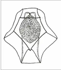 The species has an anterior nectophore that is the same width and length but it does not provide wing functions. A transverse ridge separates the ventral facet from the apico-ventral facet. The posterior nectophore can have up to 5 teeth on one comb. It also has lateral ostial teeth that are closer to the dorsal tooth rather than the ventral teeth.[3]