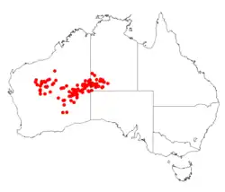 This species is native to central Western Australia and the south-west of the Northern Territory where it is found on sand dunes, sandplains and gravelly hillslopes growing in red sandy lateritic based soils. It occurs in the Central Ranges, Gascoyne, Gibson Desert, Great Sandy Desert, Great Victoria Desert, Little Sandy Desert, Murchison and MacDonnell Ranges bioregions of Western Australia and the Northern Territory.[6][7]