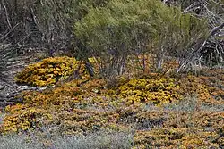 Acacia acanthaster is a rigid, densely-branched, domed shrub that typically grows to 0.2–0.5 m (7.9 in – 1 ft 7.7 in) high and 1–2.5 mm (0.039–0.098 in) wide. Its branchlets are glabrous, and divided near the ends into a few short, radiating, leafless spines. The phyllodes are glabrous, flat and linear, 3–8 mm (0.12–0.31 in) long and 0.5–1 mm (0.020–0.039 in) wide. Between 18 and 27 golden-yellow flowers are arranged in 1 or 2 spherical heads 3.0–3.5 mm (0.12–0.14 in) long on a peduncle 6–11 mm (0.24–0.43 in) long. Flowering occurs from August to October and the pods are curved or loosely coiled, 35 mm (1.4 in) long, 1.5–2.5 mm (0.059–0.098 in) wide and resemble a string of beads. The seeds are elliptic, about 2 mm (0.079 in) long and have a white, club-shaped aril.[2][3][4][5]