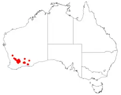 This acacia grows on roadsides, low hills, or ridges in whipstick mallee or gimlet woodland mainly from near Hyden to the Bremer Range in the Avon Wheatbelt, Coolgardie and Mallee bioregions of inland south-western Western Australia.[2][6]