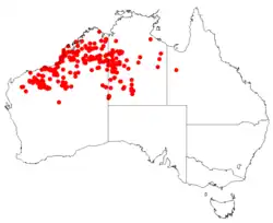 Grey-whorled wattle is widespread on red sandy soils, sandstone and ironstone gravel, and grows on coastal dunes, stony plains and ridges. In Western Australia it is found in the Central Kimberley, Dampierland, Gascoyne, Great Sandy Desert, Little Sandy Desert, Northern Kimberley, Ord Victoria Plain, Pilbara and Tanami IBRA bioregions.[5] It is also found in the central western parts of the Northern Territory.[3][11]