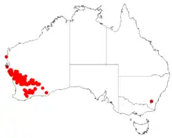 This species of Acacia often grows in low lateritic or limestone hills and granite outcrops in a variety of soil types in the Avon Wheatbelt, Coolgardie, Geraldton Sandplains, Mallee, Murchison and Yalgoo bioregions of south-western Western Australia.[2][3][4]