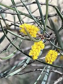 Acacia aneura is a variable shrub or small tree that typically grows to a height of 2.5–7 m (8 ft 2 in – 23 ft 0 in), sometimes up to 10 m (33 ft) and is often multistemmed with a bushy crown.[3] Its phyllodes are flat, narrowly linear to narrowly elliptic, 40–100 mm (1.6–3.9 in) long and mostly 1.5–3 mm (0.059–0.118 in) wide, straight or slightly curved.[4] The flowers are borne in a cylindrical head in the axils of phyllodes on a hairy peduncle 3–10 mm (0.12–0.39 in) long. The heads are 15–25 mm (0.59–0.98 in) long and bright yellow.[4] Flowering occurs from March to May[4] or August[3] and the pod is more or less straight and flat, 20–40 mm (0.79–1.57 in) long and 7–15 mm (0.28–0.59 in) wide with a winged edge.[4] The pods are papery, brown to greyish-brown, containing elliptic to oblong or egg-shaped seeds 3.5–5 mm (0.14–0.20 in) long and 2.5–3.0 mm (0.098–0.118 in) with a small whitich or cream-coloured aril.[3]