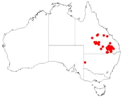 Miles mulga grows in thickets or dense populations in the western parts of the Darling Downs and around Maranoa, where it grows in shallow gravelly or loamy sandy soils often over sandstone.[3][4]