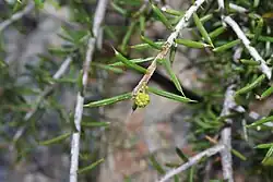 Acacia argutifolia is a low, spreading, intricate shrub that typically grows to a height of 20–70 cm (7.9–27.6 in), dividing at ground level into three or four main branches. Its phyllodes are linear, triangular in cross section, 6–13 mm (0.24–0.51 in) long and about 1 mm (0.039 in) wide with a midrib prominent on the lower surface. There are stipules 1.5–2 mm (0.059–0.079 in) long at the base of the phyllodes. The phyllodes are sharply-pointed and glabrous, sometimes with a gland on the upper surface. The flowers are arranged in a spherical head at the base of phyllodes on a peduncle 5 mm (0.20 in) long with 23 to 25 pale yellow flowers. Flowering occurs from late July to January, and the fruit is a somewhat papery, narrowly oblong pod up to 40 mm (1.6 in) long and 2–4 mm (0.079–0.157 in) wide with dull brown seeds about 3 mm (0.12 in) long and 1.8 mm (0.071 in) wide.[2][3][4][5]